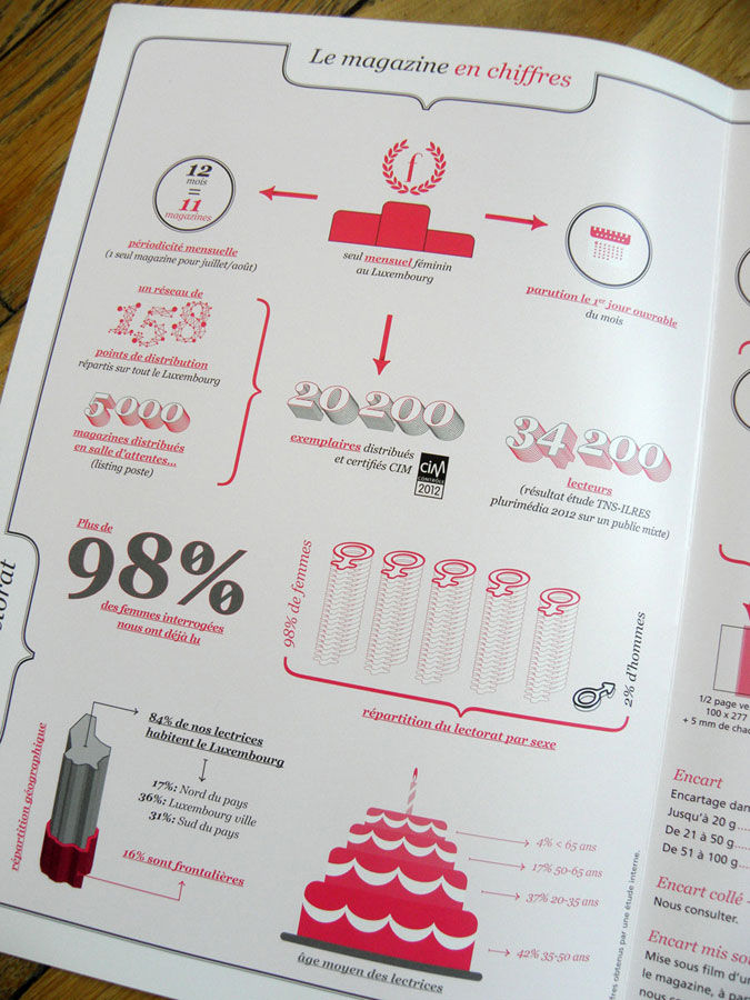 Réalisation de la plaquette Tarif 2014 (print & web) du Magazine Femmes magazine. Traitement graphique des chiffres et statistiques du magazine afin de proposer une lecture ludique en datagraphic. Réalisé pour le compte de l’agence Alinéa communication.