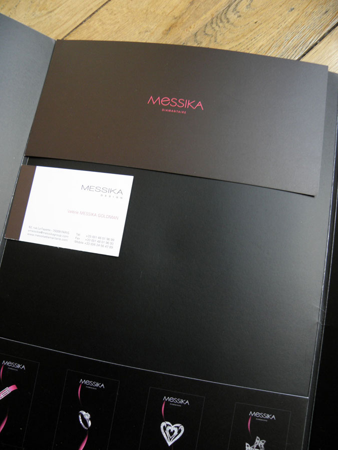 Réalisation de la papeterie et des chemises de présentation du Bijoutier Messika Design. Réalisé pour le compte de l’agence MLM communication.